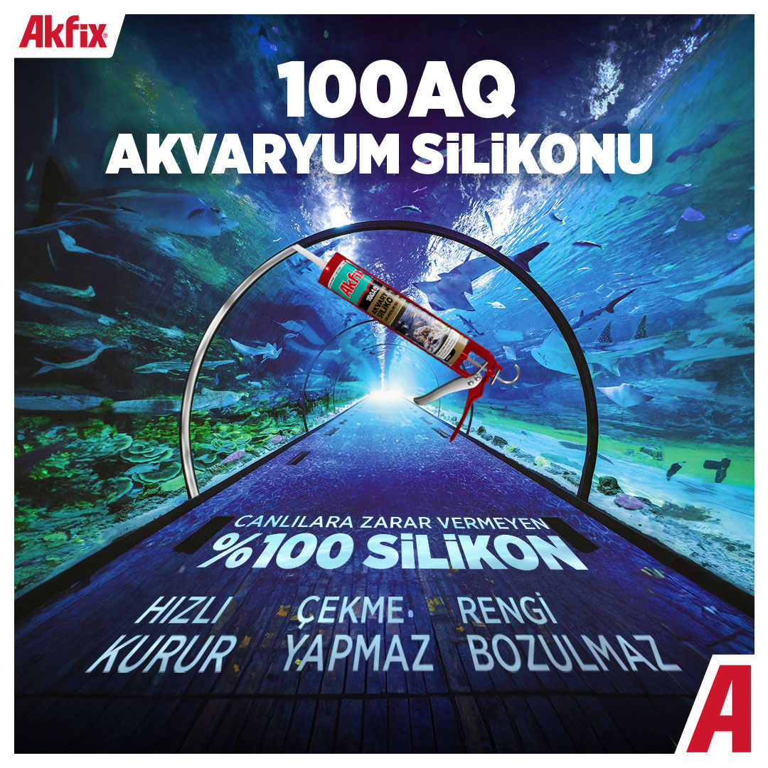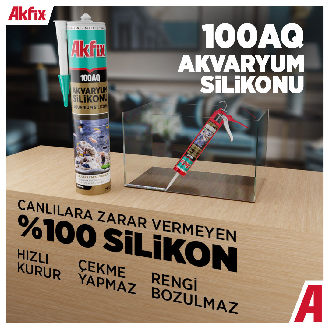 Akfix 100AQ, akvaryum imalatında ve cam yapıştırma işlerinde kullanıIan, balıklara ve akvaryumda yaşayan canlılara zarar verebilecek kimyasallar içermeyen %100 silikondur.